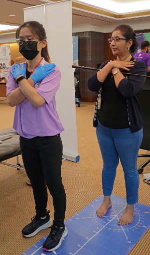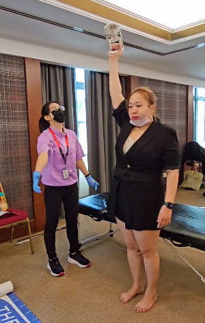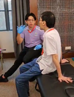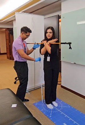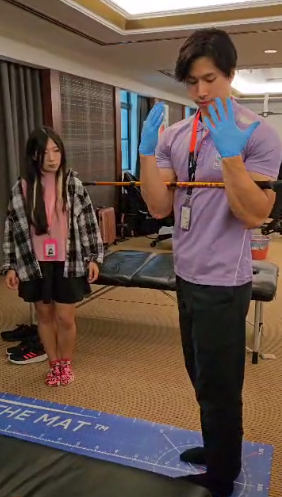 In these pictures you will see us assessing using the MAT Analysis. We measured trunk rotation, side flexion, grip strength and upper limb tension tests for nerve mobility. These tests would help us identify generic deficits that would direct our more specific investigations.